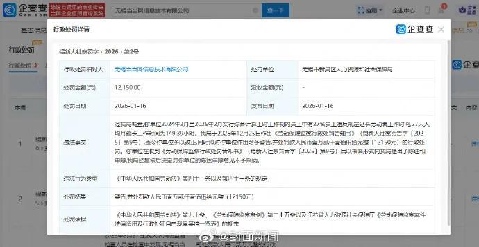企查查APP显示,近日,无锡当当网信息技术有限公司违反劳动法被罚12150元。