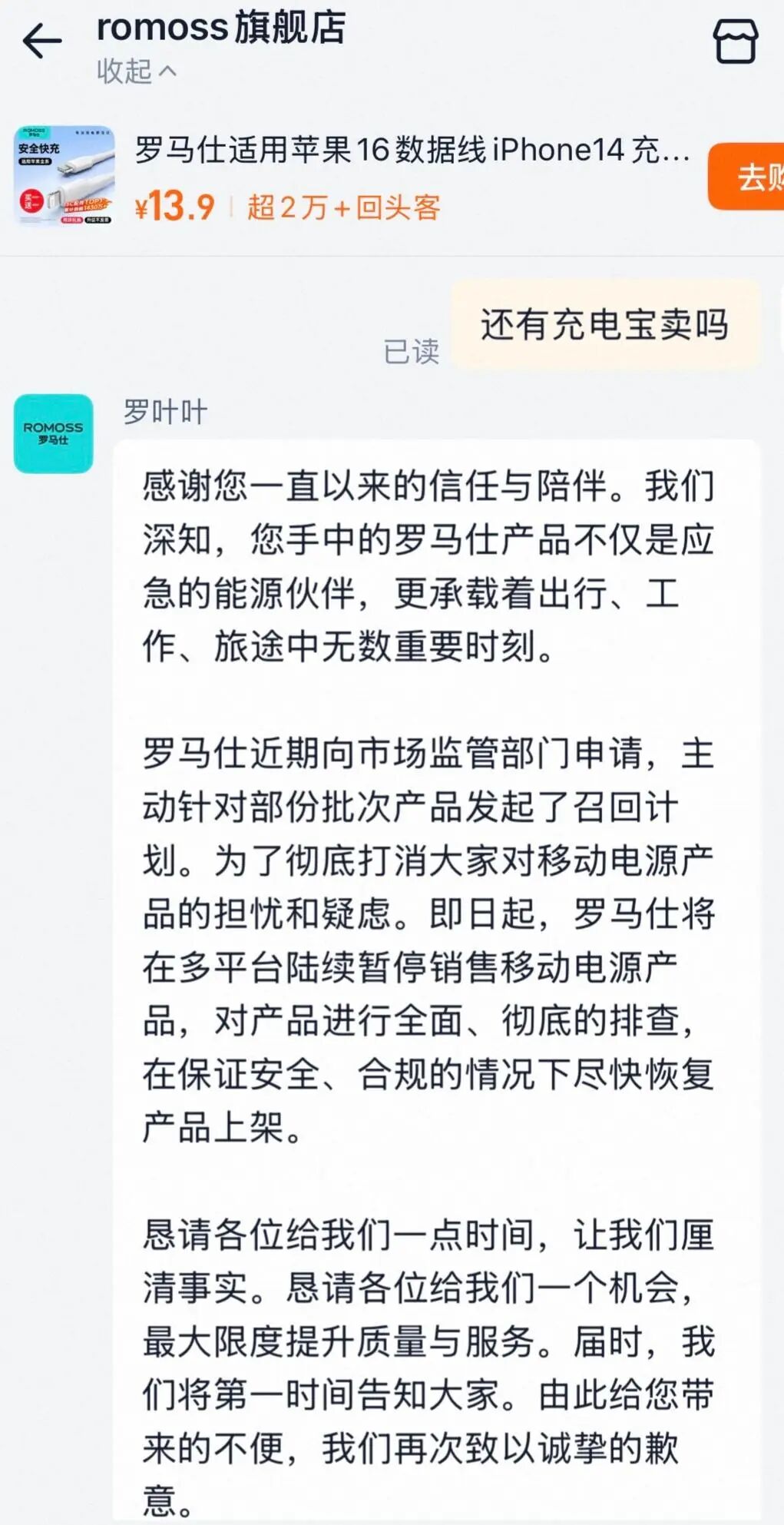 罗马仕遭市场监管总局通报,官方旗舰店已下架充电宝,只卖充电器和数据线
