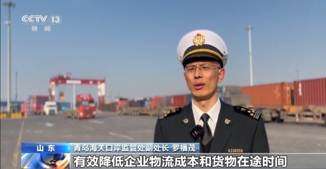 青岛海关口岸监管处副处长 罗福茂:对符合条件的货物,企业可实现“一次报关、一次查验”,免于办理转关手续,货物“零等待”换装,有效降低企业物流成本和货物在途时间。