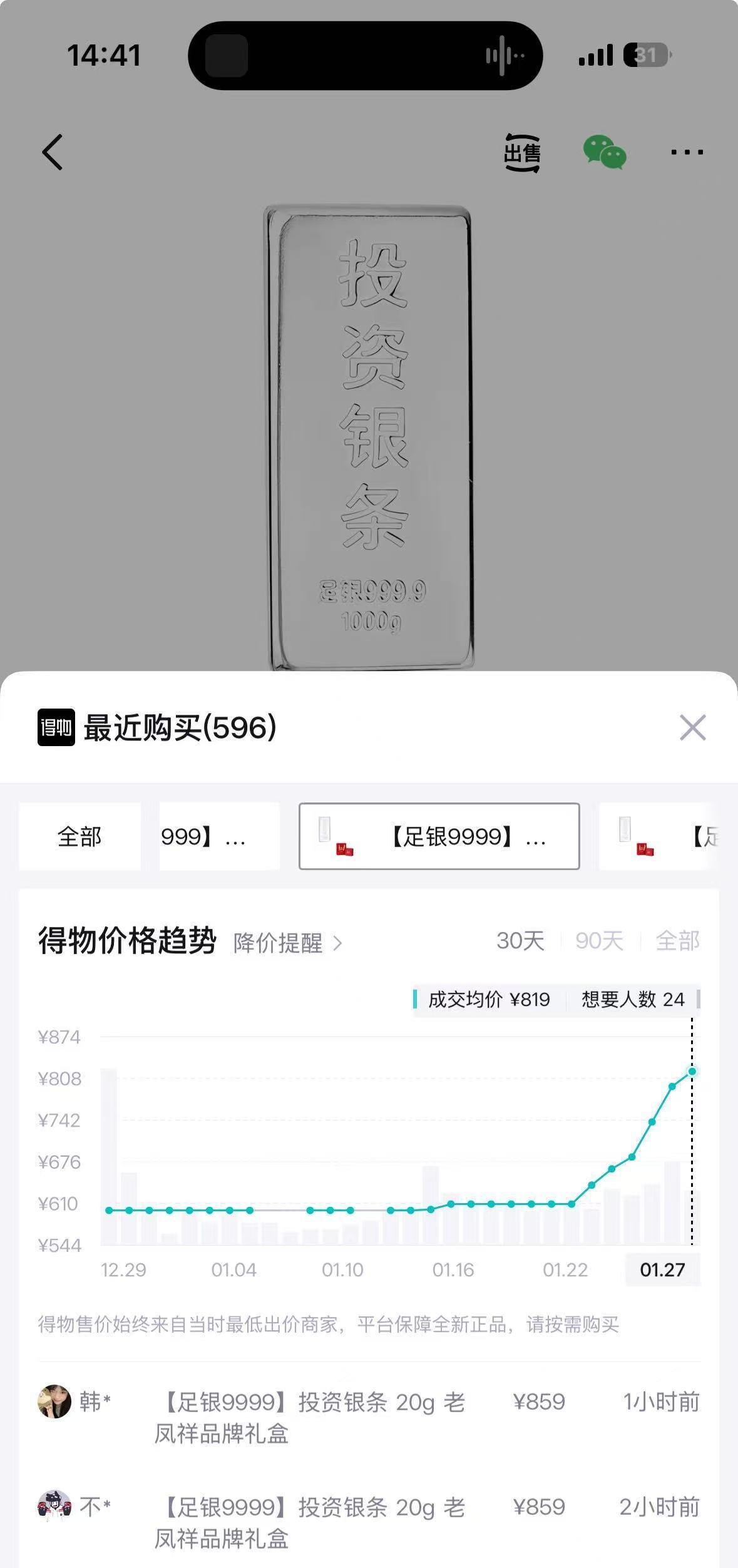 由于涨幅大大超过了黄金,金银比持续下降,投资银条比金条也更受欢迎。记者随机打开得物App查看,以老凤祥投资银条(20g)为例,近一周价格由609元上涨至859元,飙涨了41%,仅1月27日当天,就上涨了7.5%。