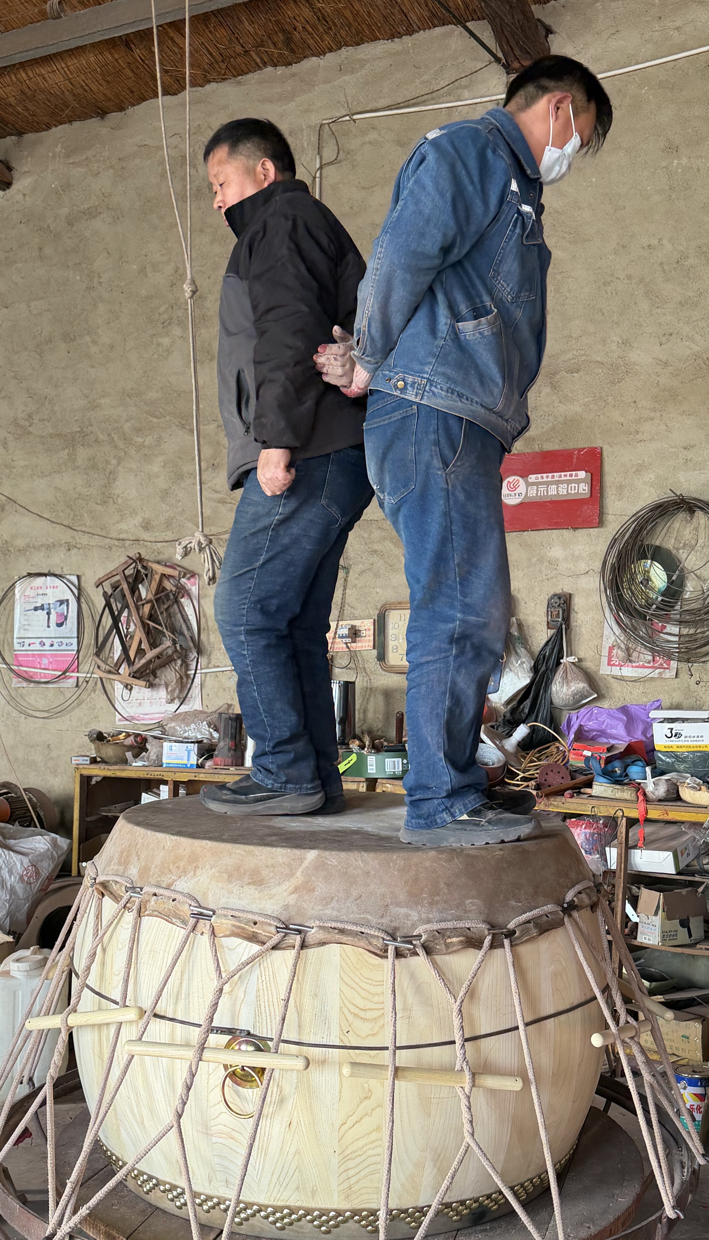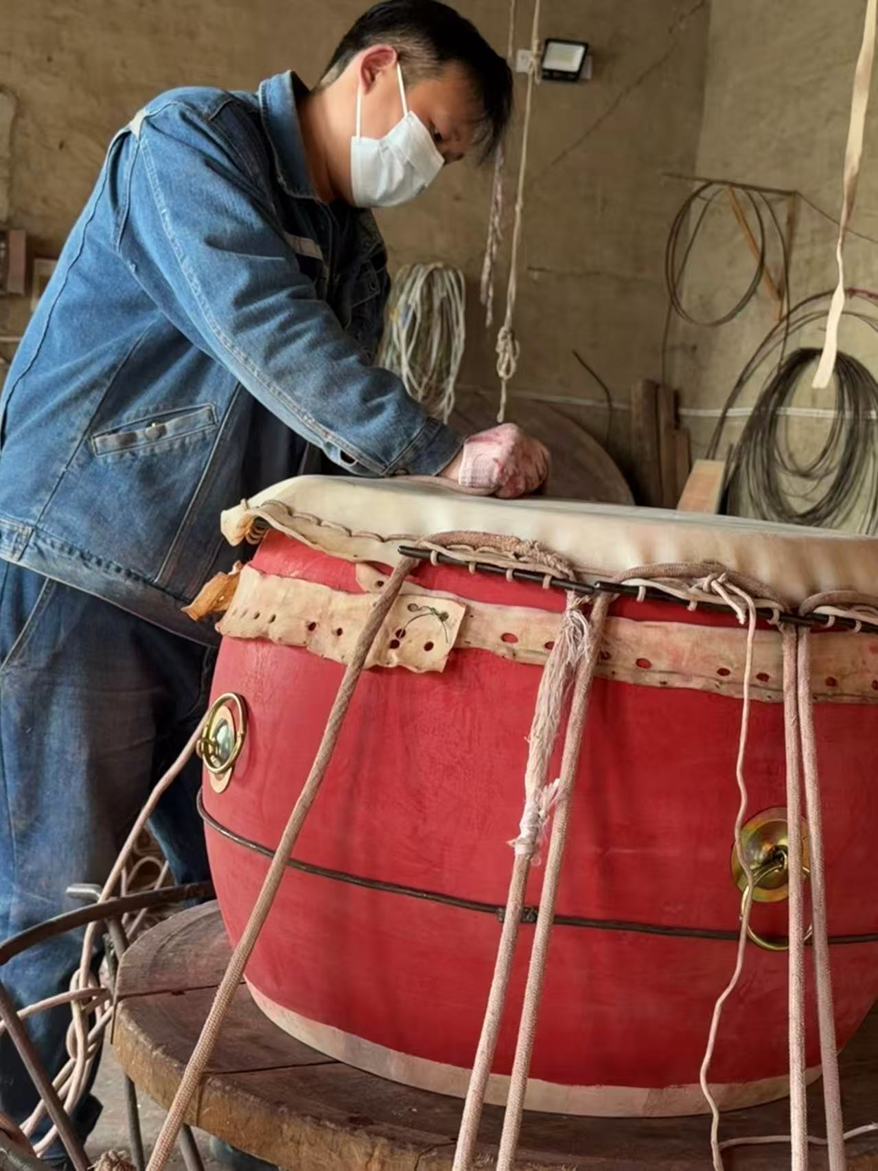 鼓面的选材同样严苛,优质黄牛皮需毛色光亮、质地坚韧,以散养黄牛为佳。“以前都是找农户收的老黄牛皮,现在数量少了,偶尔也会用合格的水牛皮,但质量标准绝不降低。”李德宝说,牛皮需经泡软、去毛、鞣制等复杂处理,才能变得柔韧适中。而制鼓过程中最关键的“踩鼓”环节,更是对匠人技艺与耐力的双重考验。“踩鼓得凭经验、靠感觉,力度要均匀,才能让鼓面张力恰到好处。”李德宝回忆,这道工序最累人,往往踩得腿脚酸软,却丝毫不能马虎,“踩不到位,鼓的声音就发闷,没有穿透力。”