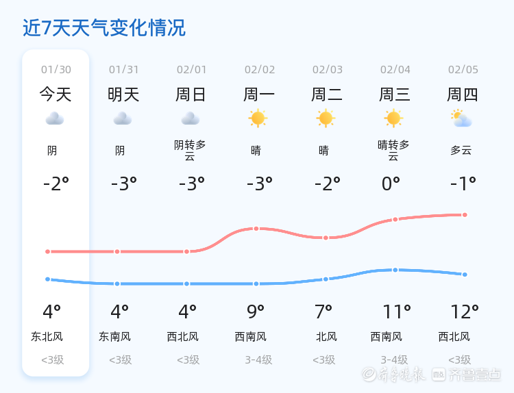 今日是2026年1月30日(农历十二月十二),淄博市迎来了一天的阴天天气。气温方面,今日最高气温为4℃,最低气温为-2℃,当前温度为-1.8℃,东风2级,空气湿度为66%,PM2.5指数为57,空气质量良好。各区天气情况基本一致,均为阴天,气温略有波动,整体较为平稳。