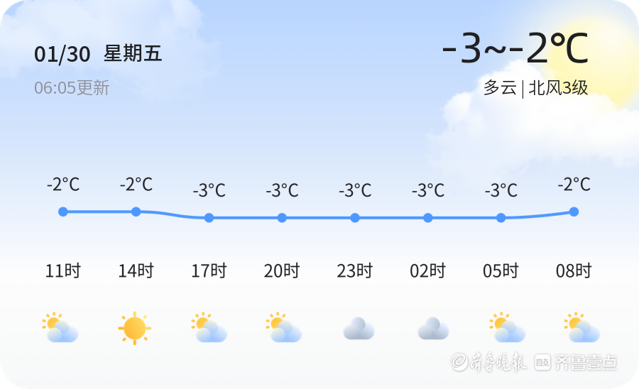 今日是2026年1月30日,农历十二月十二,星期五。威海市今日天气多云,北风3级,气温范围在-3℃到-2℃之间。目前空气湿度为42%,PM2.5浓度为25,空气质量状况为优。今日气温较低,市民出行请注意防穿着厚实的冬装,同时由于北风较大,行走时请注意远离广告牌等高空悬挂物。此外,建议市民在早晚温差较大的时段减少外出,避免感冒。今天的天气状况总体适宜出行,但寒冷天气可能对部分市民的健康产生影响,尤其是老人和儿童,需特别注意保暖。