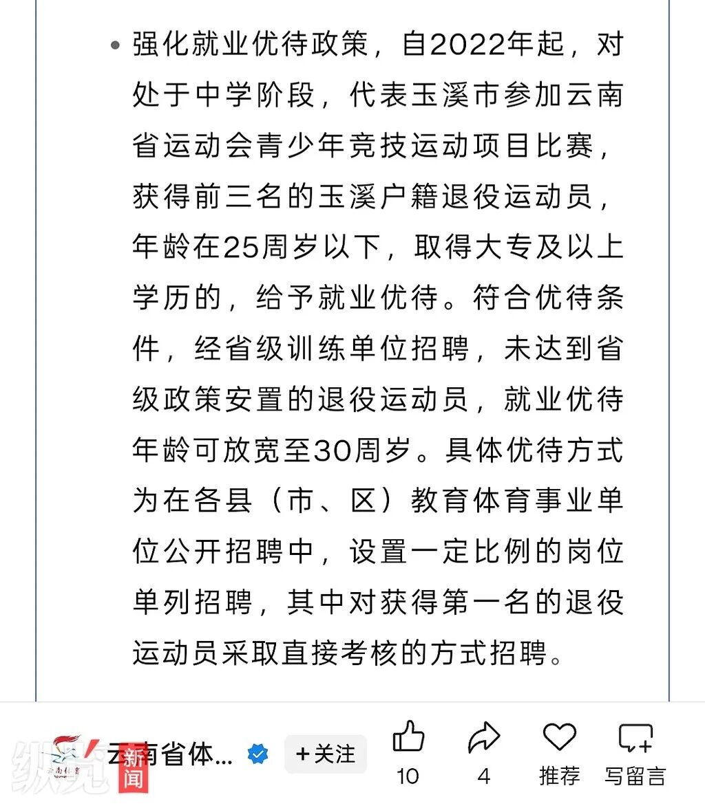 该文件第十二条写明:自2022年起,对处于中学教育阶段,代表玉溪市参加云南省运动会青少年竞技运动项目比赛,获得前三名的玉溪户籍退役运动员,年龄在25周岁以下,取得大专及以上学历的,给予就业优待。符合优待条件,经省级训练单位招聘后,未达到省级政策安置的退役运动员,就业优待年龄可放宽至30周岁。具体优待方式为:在各县(市、区)教育体育事业单位公开招聘中,设置一定比例的岗位(原则上为教练员、体育教师岗位)单列招聘,其中,对获得第一名的退役运动员采取直接考核的方式招聘。退役运动员单列岗位招聘并入全市年度事业单位公开招聘一并组织。