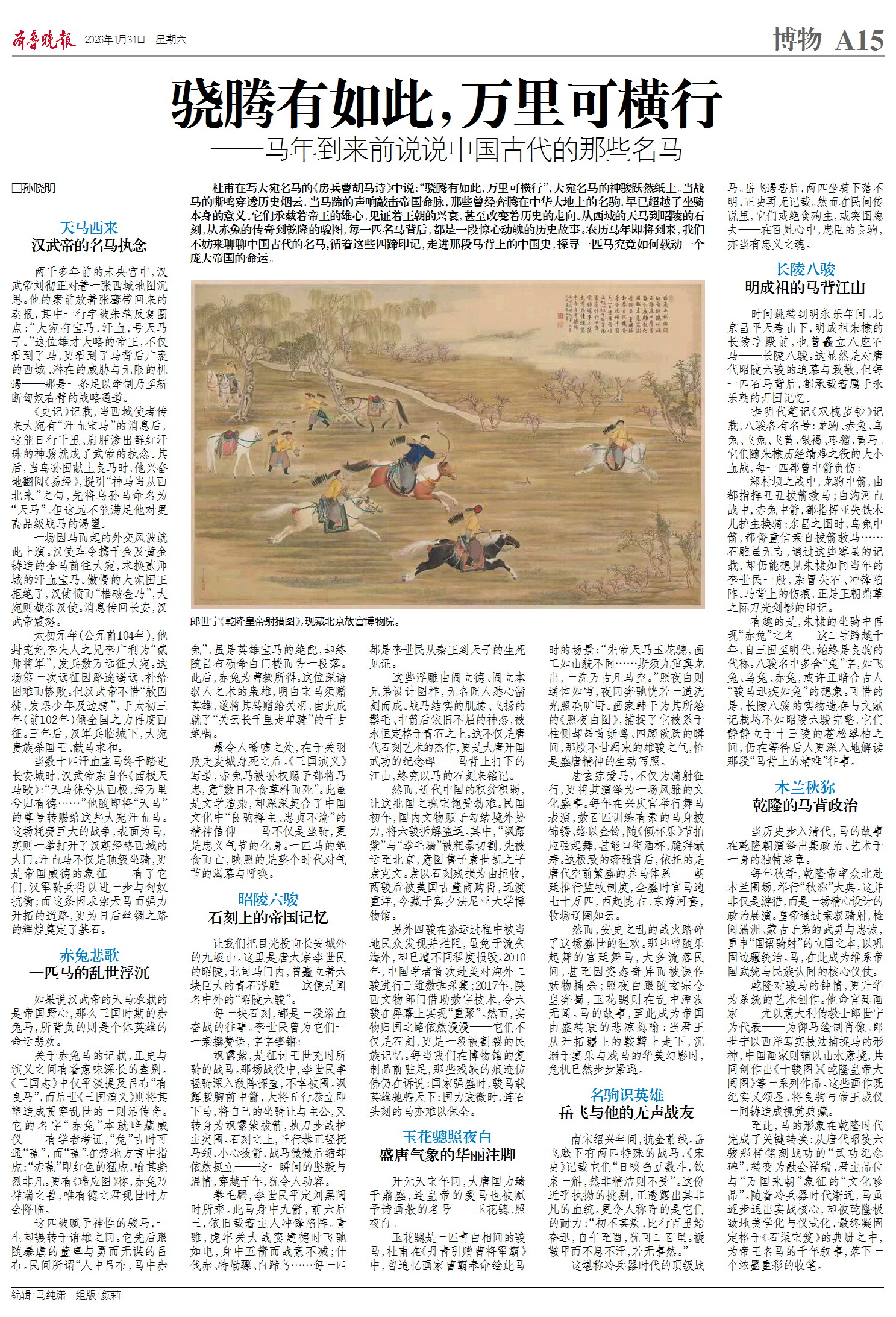 杜甫在写大宛名马的《房兵曹胡马诗》中说:“骁腾有如此,万里可横行”,大宛名马的神骏跃然纸上。当战马的嘶鸣穿透历史烟云,当马蹄的声响敲击帝国命脉,那些曾经奔腾在中华大地上的名驹,早已超越了坐骑本身的意义。它们承载着帝王的雄心,见证着王朝的兴衰,甚至改变着历史的走向。从西域的天马到昭陵的石刻,从赤兔的传奇到乾隆的骏图,每一匹名马背后,都是一段惊心动魄的历史故事。农历马年即将到来,我们不妨来聊聊中国古代的名马,循着这些四蹄印记,走进那段马背上的中国史,探寻一匹马究竟如何载动一个庞大帝国的命运。