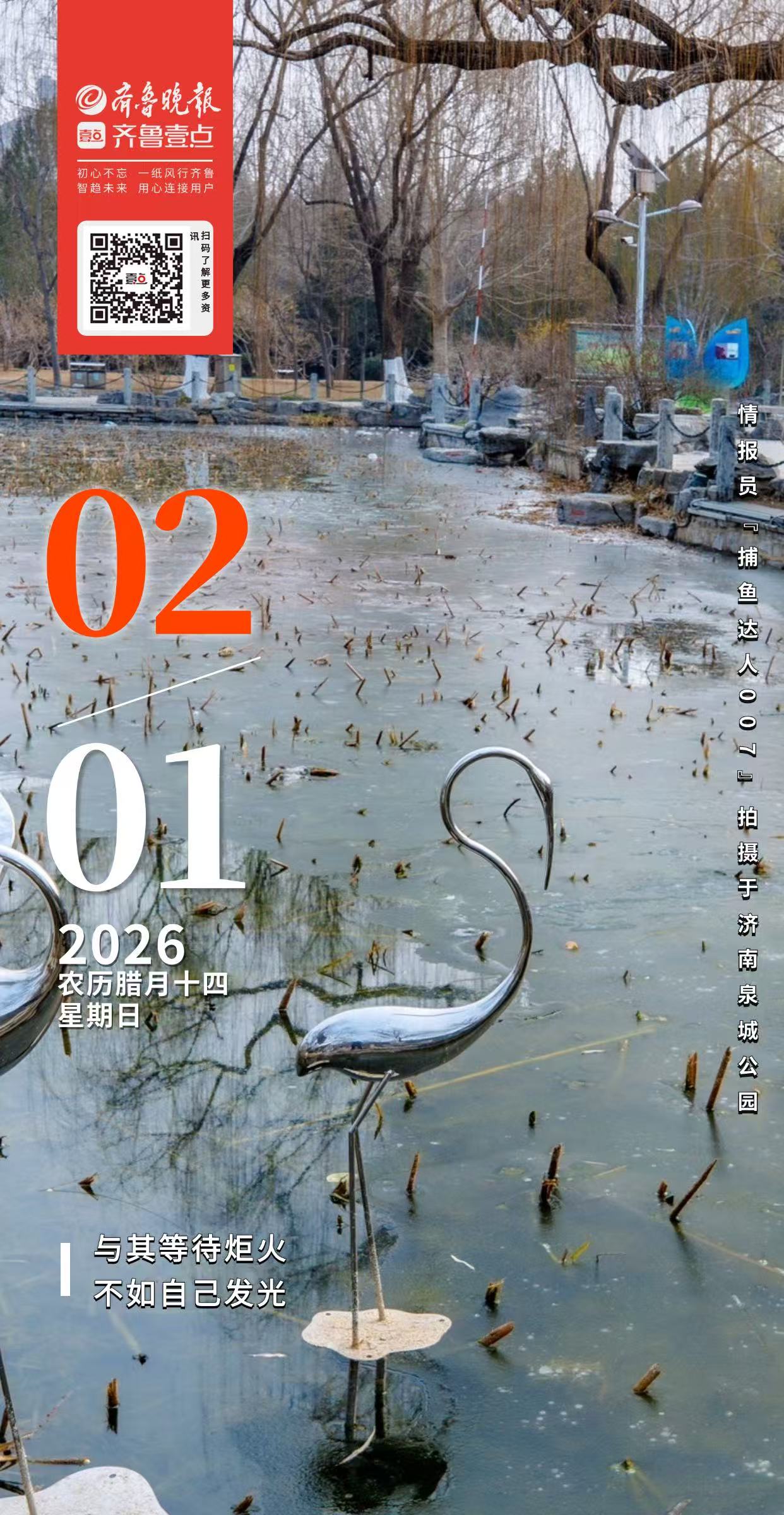 冬日的泉城公园,疏枝在寒风中挺立。湖面一半凝霜成冰,一半漾着清波,绿头鸭振翅游弋,自在悠然。腊梅悄然绽放,暗香缕缕,沁人心脾。游人不多,缓步徜徉,赏梅观鸭、在冬日的清寂里,感受一份难得的安然。