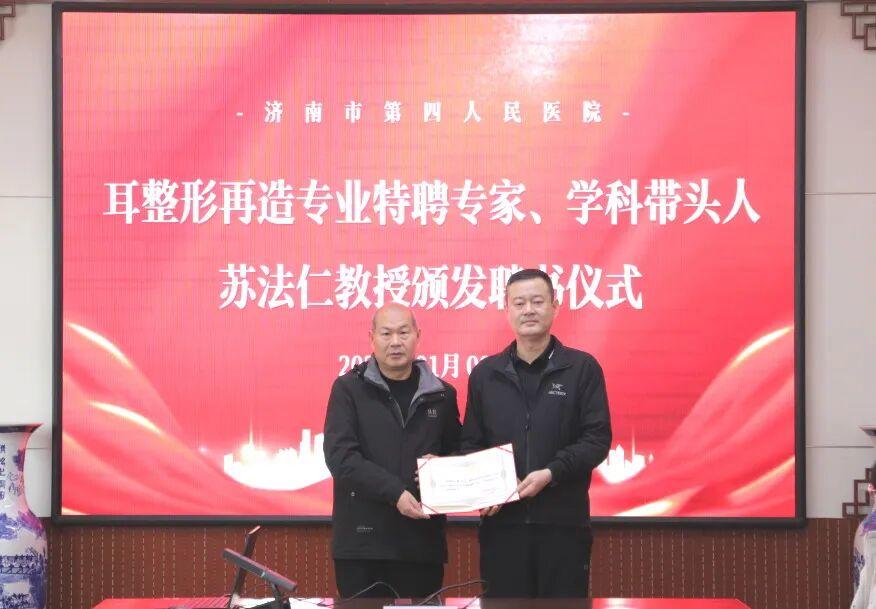 近日,济南市第四人民医院隆重举行耳整形再造专业特聘专家、学科带头人苏法仁教授聘任仪式。此次标志着医院在耳畸形矫治、外耳再造及听力重建领域的学科建设迈入新阶段,将为广大耳畸形患者带来更优质、高效的医疗服务。