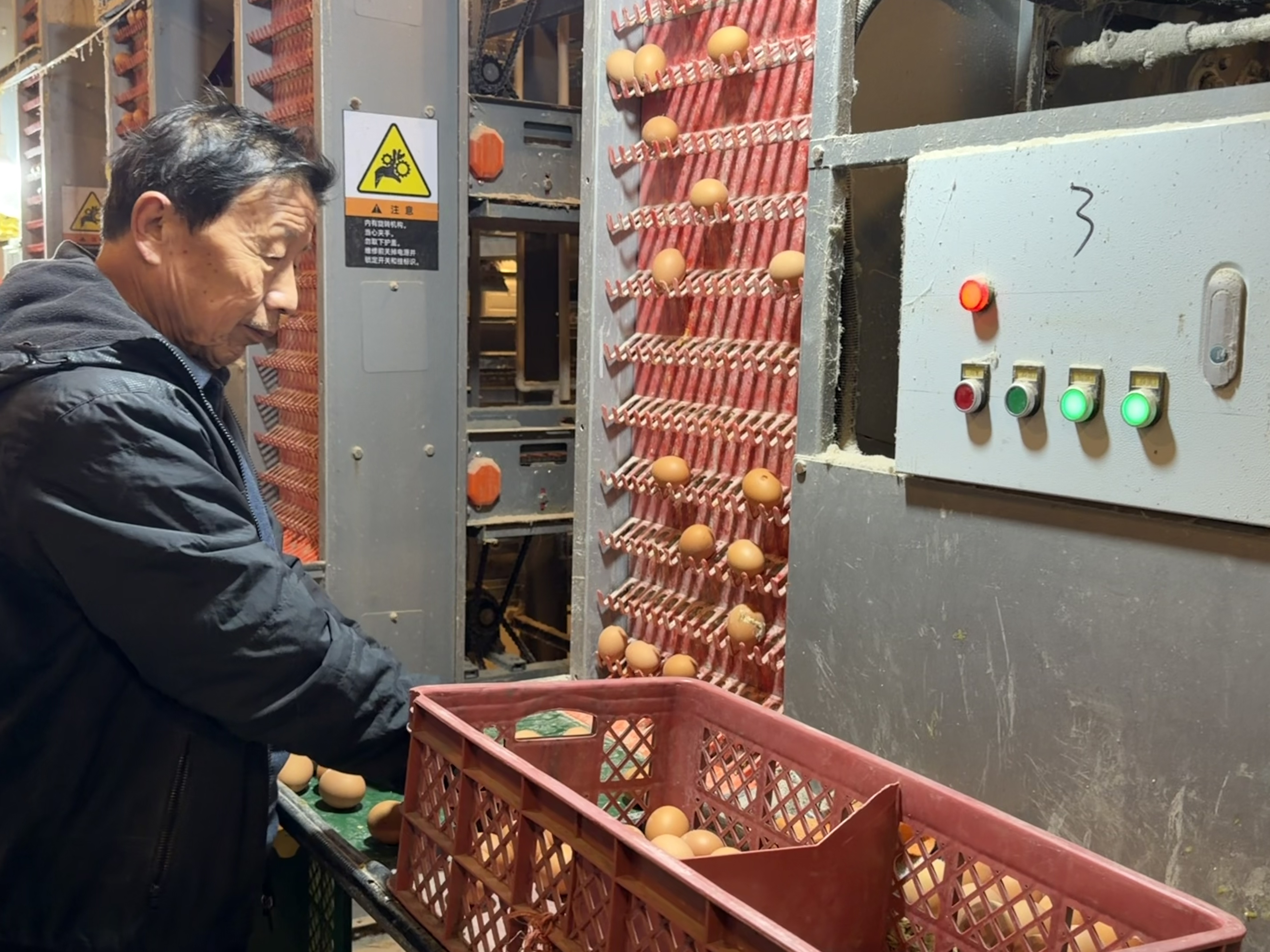 如今,产业园已实现饲喂、清粪、集蛋全程智能化运行,5万只蛋鸡的日常管理仅需一人操控即可,而工人们也都成了懂技术、会管理的“养殖能手”。每天清晨七点半,饲料投喂、鸡舍清扫、设备检查同步开展;上午8点开始分拣鸡蛋,剔除残次蛋后分类装筐,11点前完成当日分拣;下午则专注于饲料储备与蛋鸡健康监测,一套标准化流程确保了每枚鸡蛋的品质。
