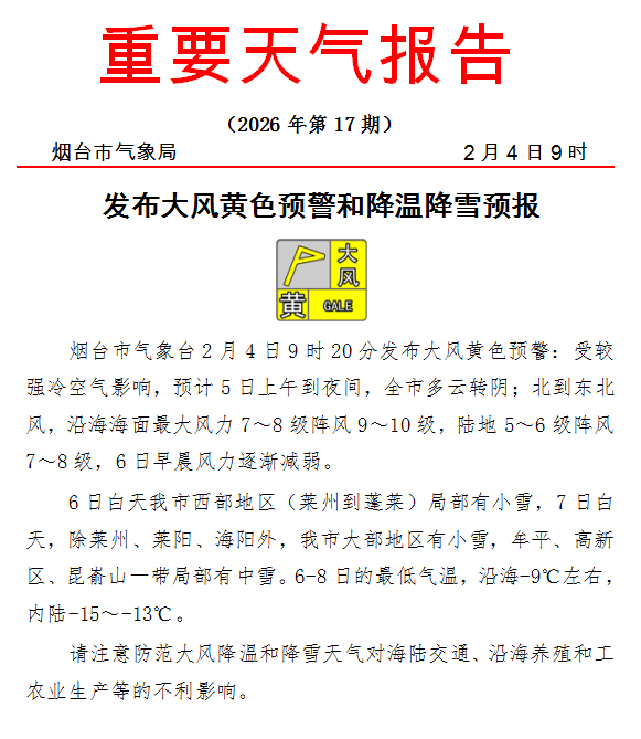 局部或迎中雪,最低气温-15~-13℃!烟台发布大风黄色预警