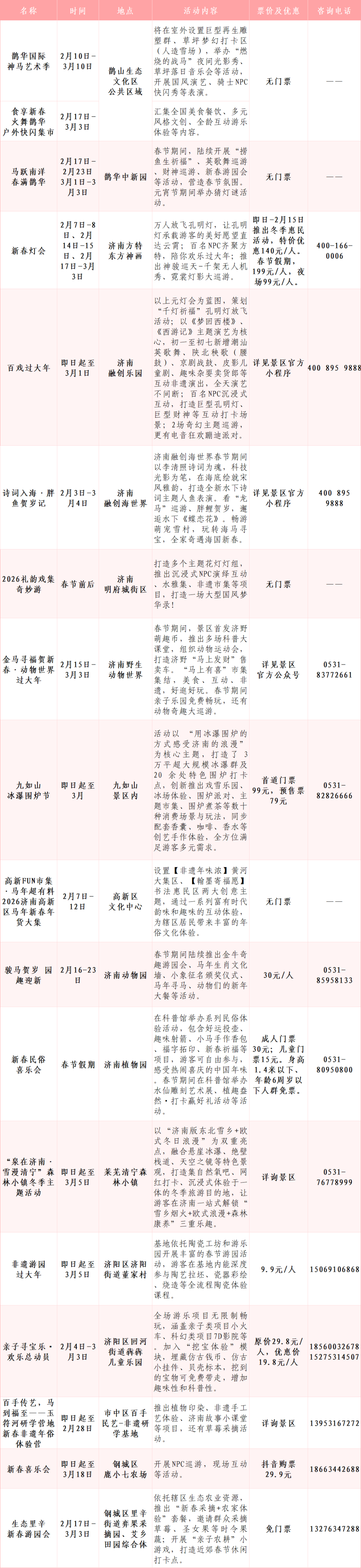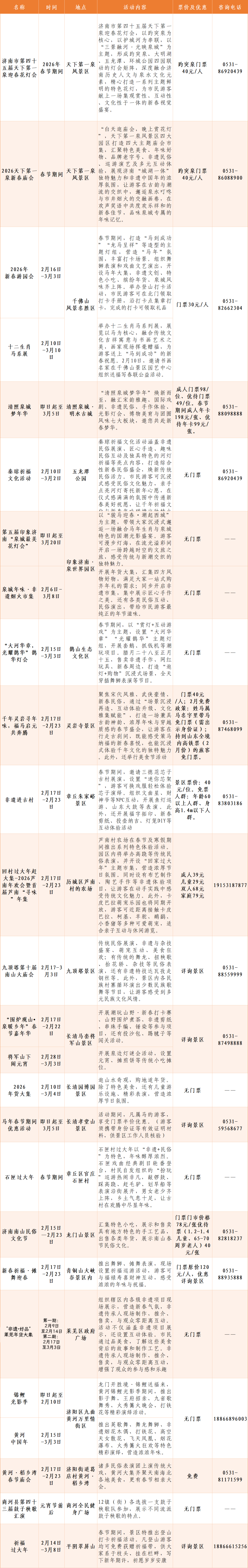 泉润新春,文旅惠民。为进一步丰富冬季文旅产品供给,满足市民游客春节前后文旅消费需求,济南市文化和旅游局启动了“这一站,济南”2026新春贺年会,并积极发动各区县文化和旅游主管部门及全市文旅行业单位,深挖泉城特色资源,围绕小年、春节、元宵节等重要节点,精心策划推出节庆民俗、潮玩亲子、激情冰雪、多彩文博、泉城好戏等五大类300多项重点文旅活动。从城区潮玩盛宴到乡村地道年味,让市民游客在泉城烟火中品味泉韵雅趣,在欢声笑语中感受新春暖意。