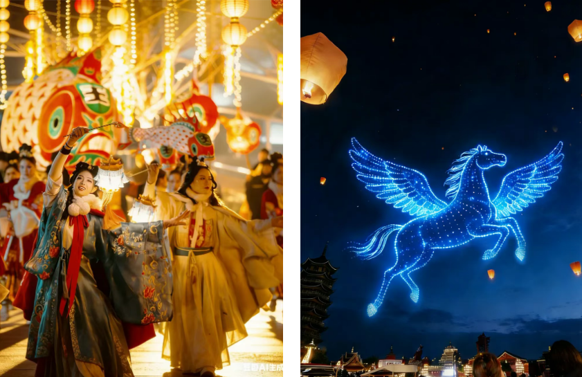 济南方特东方神画、济南融创乐园为市民游客提供沉浸式游玩体验,千架无人机秀、非遗演艺、孔明灯放飞、NPC互动、主题演艺巡游,年味与潮玩融合,惊喜不断。