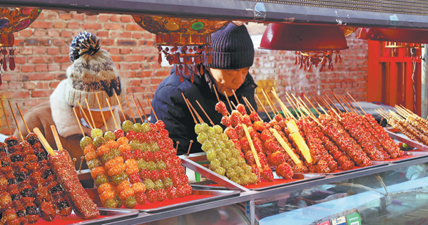 A stall of candied hawthorn skewers is seen at a rural market in Jinan, Shandong province, on Jan 17. FANG YINGJIE/FOR CHINA DAILY
