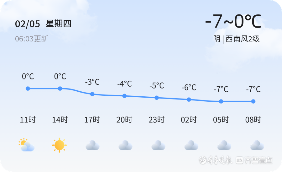 今天是2月5日,农历十二月十八,烟台市迎来了一股冷空气。今日天气阴沉,气温较低,全市各区的最高气温为0℃,最低气温达到-7℃。目前气温为3.1℃,空气湿度为69%,PM2.5指数为150,空气质量处于良好水平。风向为西南风2级,整体天气状况较为寒冷。