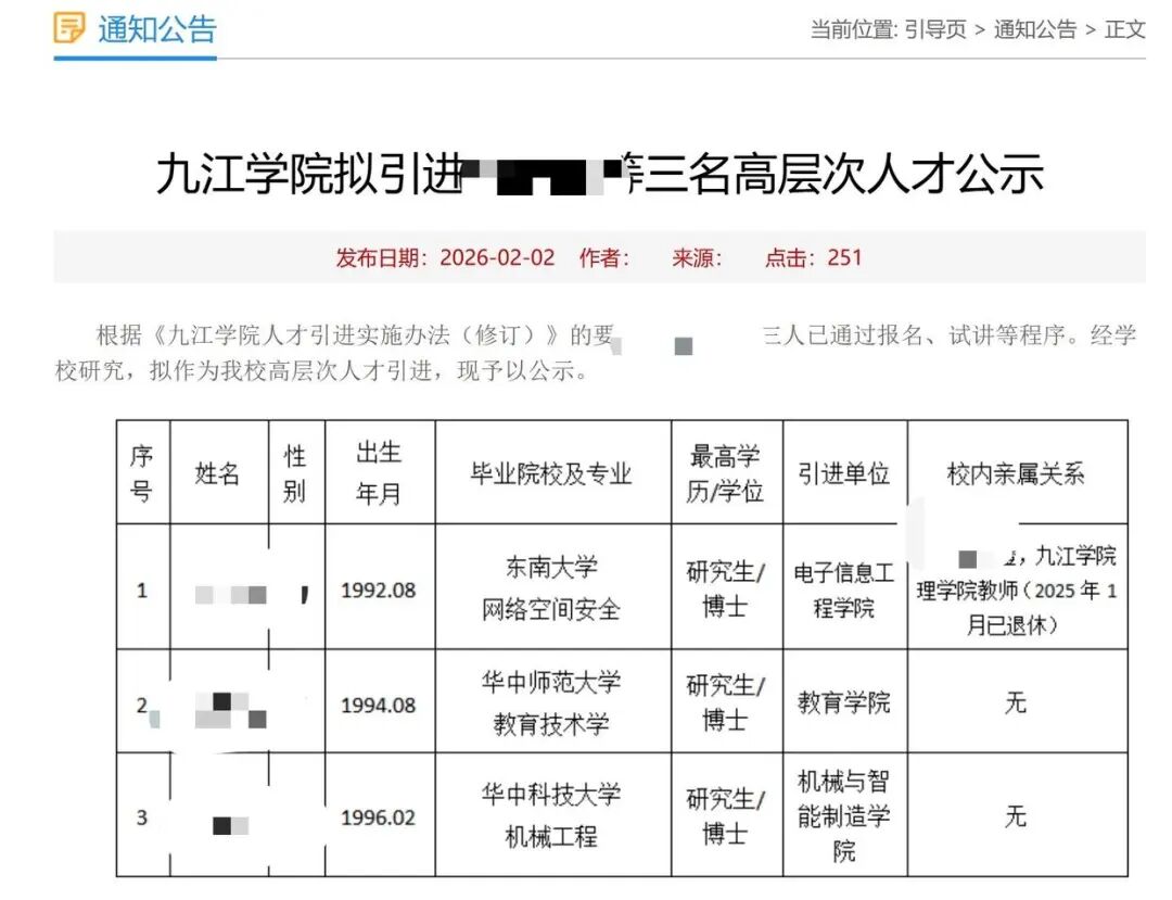 2月2日,九江学院发布一则拟引进三名高层次人才的公示,其中一名拟引进人才的父亲是该校退休教师,九江学院对此亲属关系进行了公开公示。