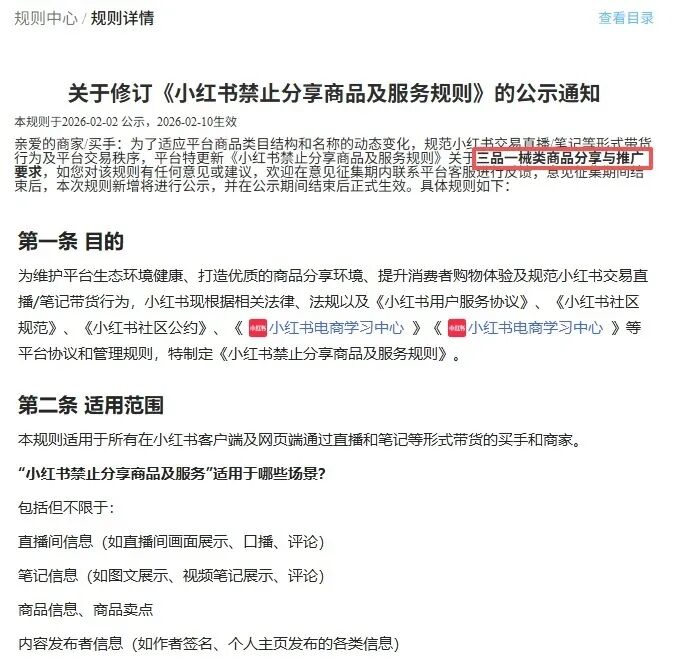 九派财经记者在小红书网站上了解到,2026年2月2日,小红书电商学习中心发布了一则修订《小红书禁止分享商品及服务规则》的公示,更新了关于“三品一械”类商品分享与推广要求:即买手不允许在直播间、笔记等场景中分享或推广OTC药品、保健食品、医疗器械、医疗及健康服务等,新规将于2月10日生效。