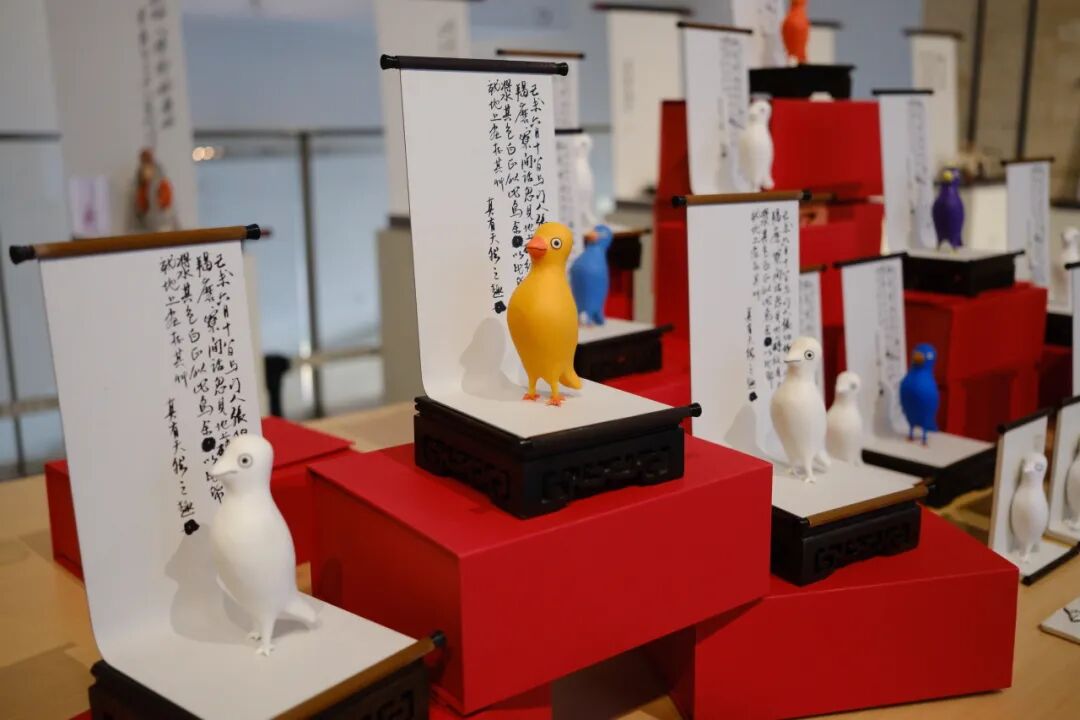 在山东美术馆二楼齐白石文创专区,有“趣儿”主题展柜,可以挑选水杯、挂件、冰箱贴、摆件等多种呆萌小鸟周边。