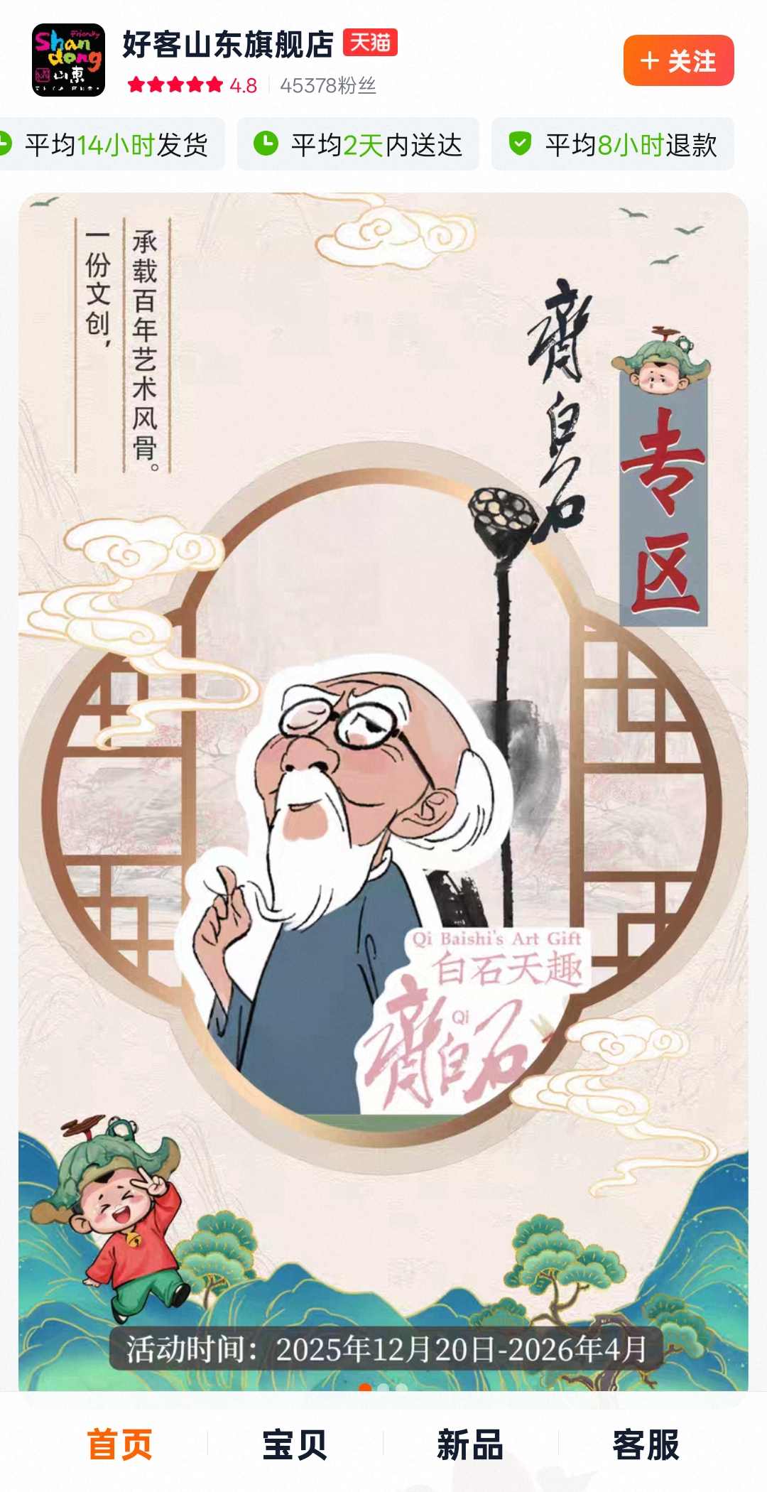 路径一:好客山东旗舰店→首页→点击「齐白石文创专区」海报进入专区选购