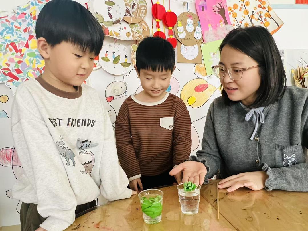 活动开始,老师化身“科学向导”,为孩子们准备了透明水杯2个、清水、洗洁精和小纸团。老师先将纸团轻轻放入清水中,纸团只是安静地沉在杯底;而将纸团放入有洗洁精的水杯后,神奇的一幕发生了:原本“安分”的纸团突然舒展、浮动起来,像一个个淘气的小精灵在水中舞蹈,孩子们瞬间被这奇妙的现象吸引,发出阵阵惊喜的欢呼声。