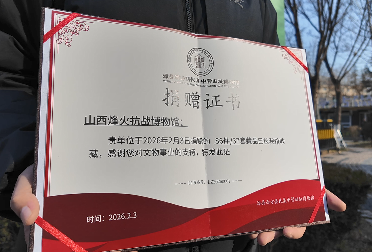 2月3日,值此潍坊获评“国际和平城市”五周年暨潍坊国际和平文化推广年启动之际,国内以战争历史反思与和平教育为宗旨的公益性馆际协作平台——“和平记忆联盟”正式成立。在成立仪式上,山西烽火抗战博物馆将86件/37套藏品捐赠给了潍县西方侨民集中营旧址博物馆。“我们相信,这批实物与潍县西方侨民集中营旧址博物馆现有的展览结合起来,能更立体、更细腻地还原那段跨越国界的共同记忆。捐赠这批文物,也是我们以实际行动支持潍坊擦亮‘国际和平城市’这块招牌。”山西烽火抗战博物馆执行馆长高林说。