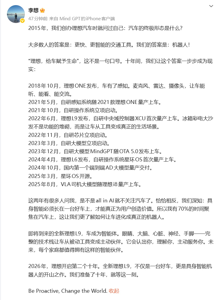 “依托坚实的财务基础,我们会保持专注,用我们最热爱的创业公司的管理模式,打造领先的具身智能产品,确保理想汽车能够穿越周期、引领技术,成为一家长期为用户和社会创造独特价值的企业。”
