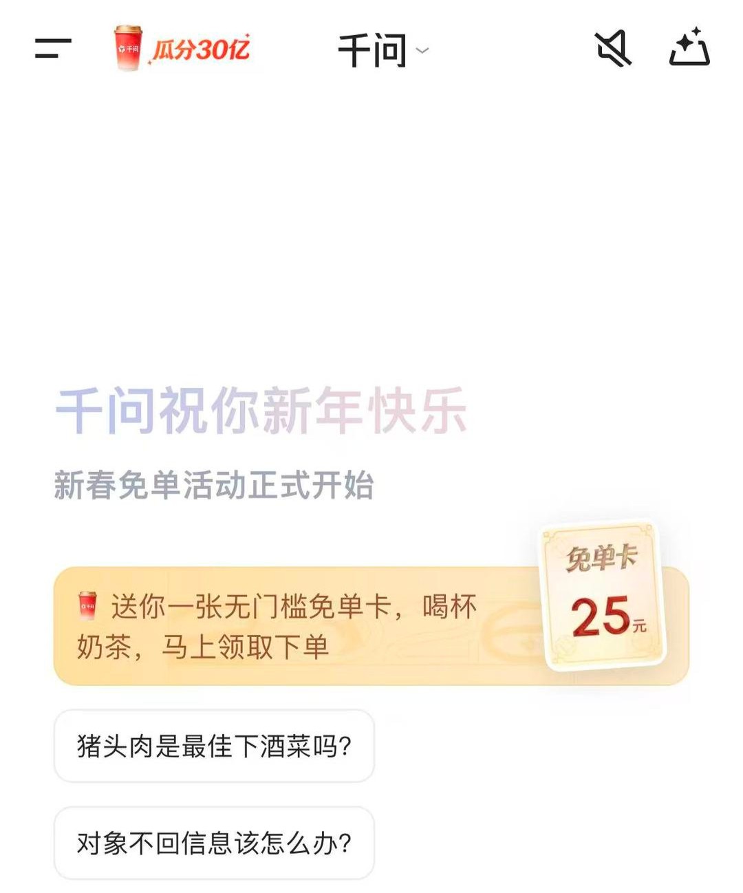 千问APP“春节30亿大免单”,喝奶茶、点外卖都能用,网友:这羊毛不薅简直亏