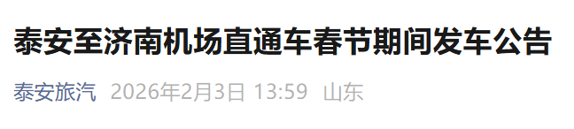 春节期间,为方便广大乘客出行,结合客运流量实际情况,泰安旅汽机场直通车自2026年2月16日(除夕)起调整发车班次,具体运行班次如下: