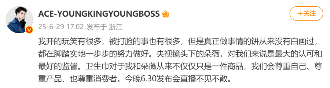 黄子韬在个人微博发文回应央视探访卫生巾工厂:“我开的玩笑有很多,被打脸的事也有很多,但是真正做事情的饼从来没有白画过,都在脚踏实地一步步的努力做好。央视镜头下的朵薇,对我们来说是最大的认可和最好的监督。卫生巾对于我和朵薇从来不仅仅只是一件商品,我们会尊重自己、尊重产品、也尊重消费者。”