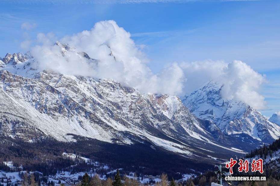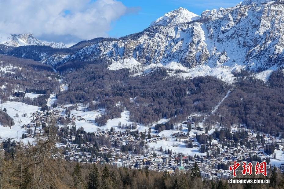 当地时间2月8日,晴空下的小镇被巍峨粉岩雪峰环抱,皑皑白雪与苍翠山林相映成趣,美不胜收。2026年米兰-科尔蒂纳冬奥会分赛区之一的意大利科尔蒂纳丹佩佐,坐落于多洛米蒂山脉腹地,素有“多洛米蒂女王”美誉。中新社记者 骆云飞 摄