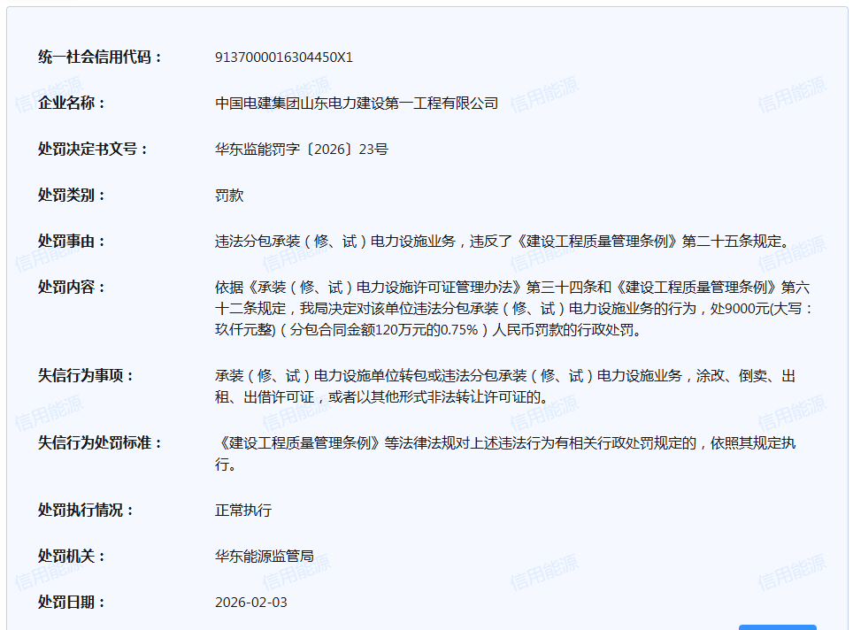 2月3日,华东能源监管局对中国电建集团山东电力建设第一工程有限公司(以下简称“山东电建一公司”)因违法分包承装(修、试)电力设施业务,依法作出行政处罚。