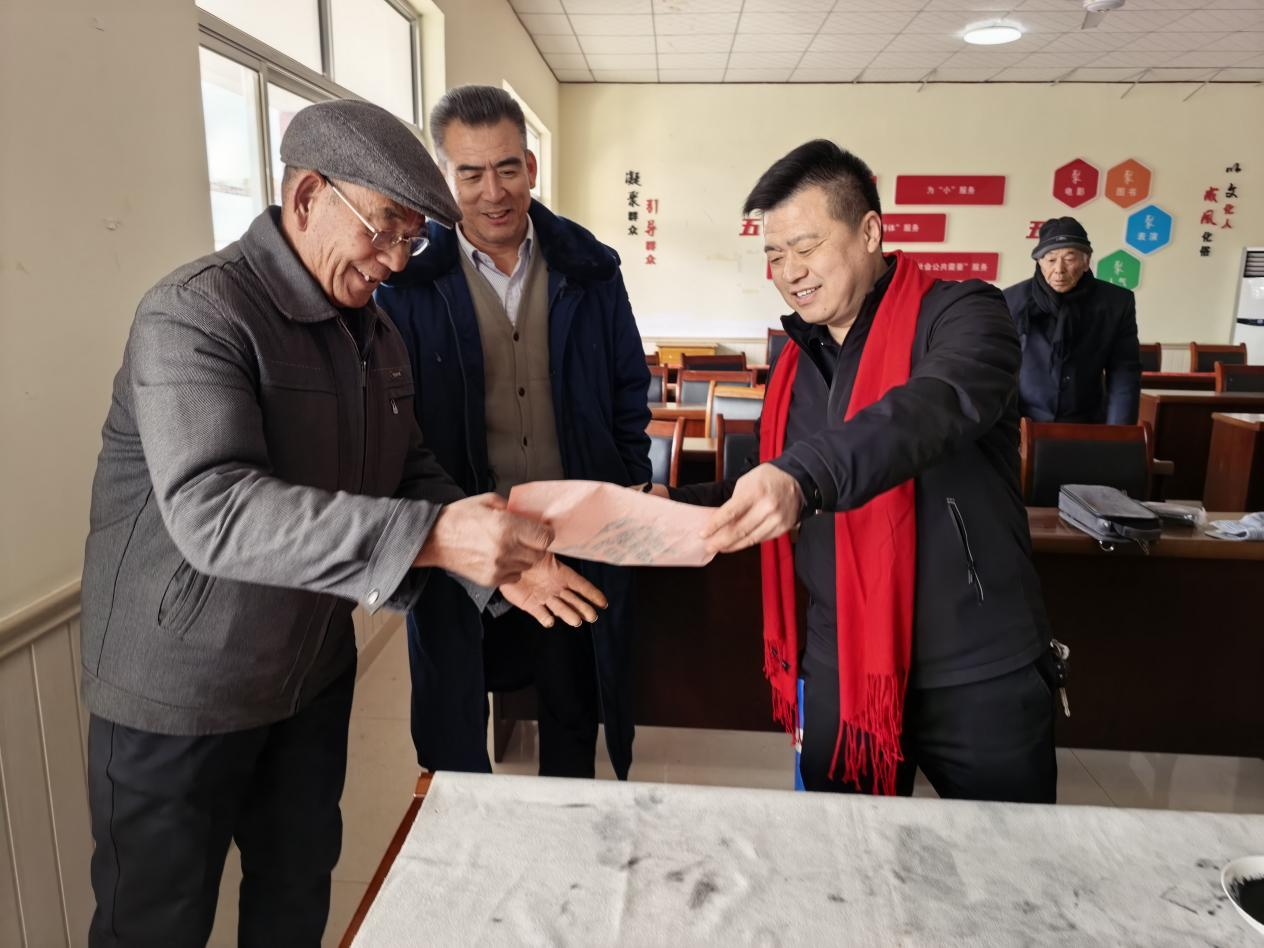 春临大地增暖意,墨润春联送福来。2026年2月6日,在新春佳节即将来临之际,东营市水务局驻陈官镇古家村工作队同村“两委”精心策划、用心组织,邀请书画艺术家宋坦克老师、杨忠祥老师等走进村庄,开展“迎新春·写春联·送祝福”主题活动,并协调争取20份暖心慰问品,发放给困难群众和老党员,让村民于墨香中感受传统,在问候里体味温情。