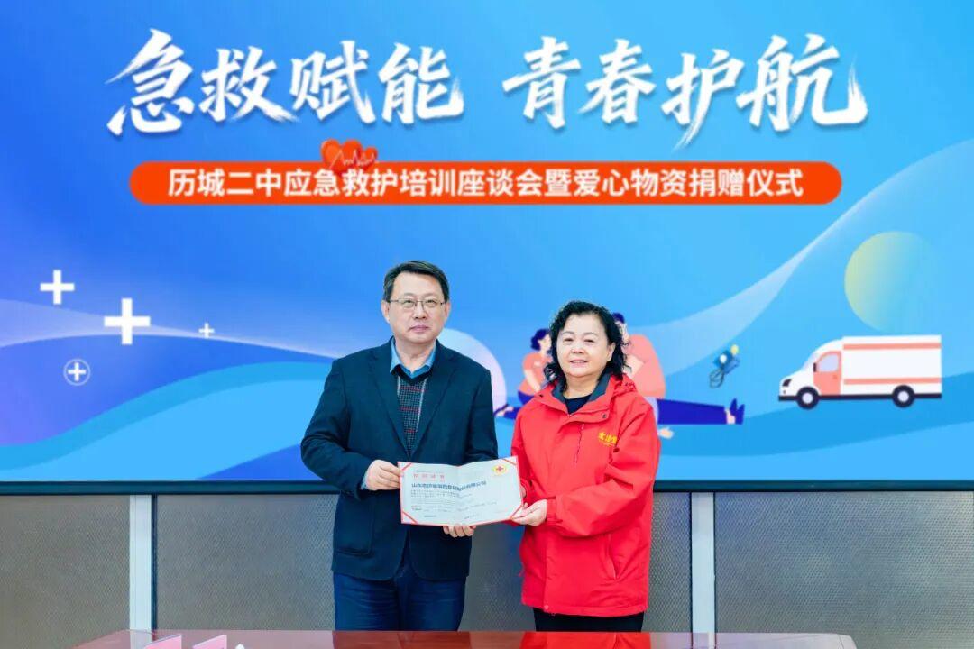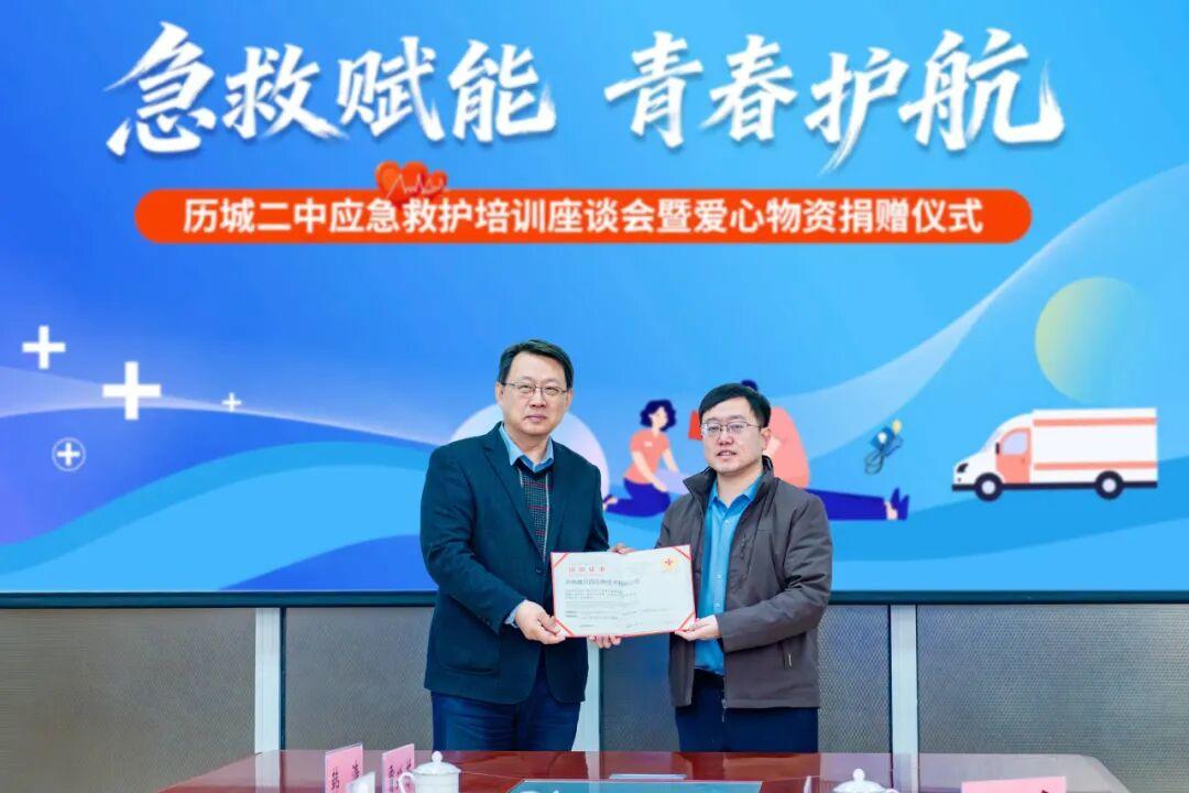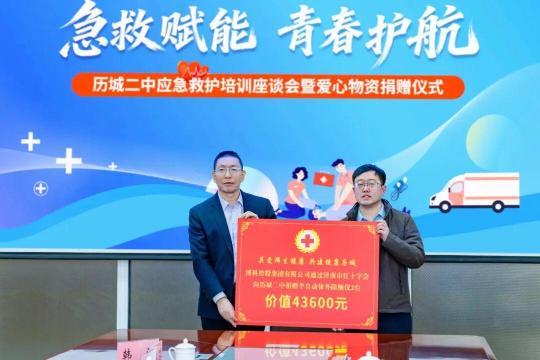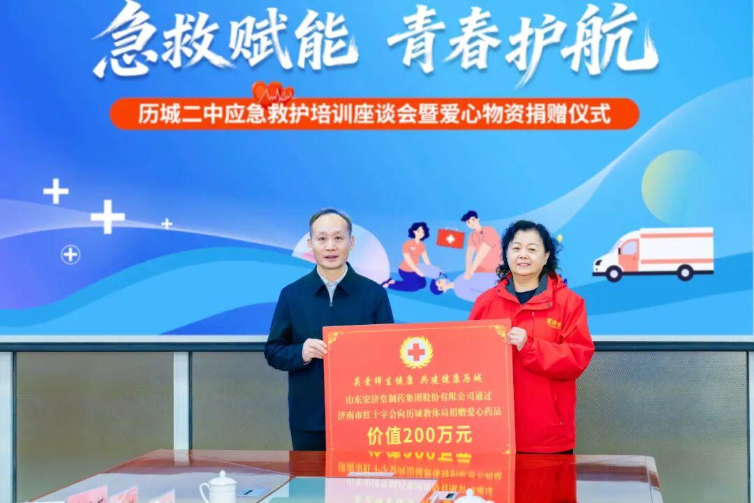 山东宏济堂制药集团股份有限公司党总支副书记袁世琪代表企业向区教育体育局捐赠了价值200万元的医药用品,博科控股集团有限公司服务中心总裁陈晓松代表企业向历城二中捐赠了2台半自动体外除颤器(AED)。济南市红十字会党组成员、副会长王永君为捐赠企业颁发了捐赠证书。