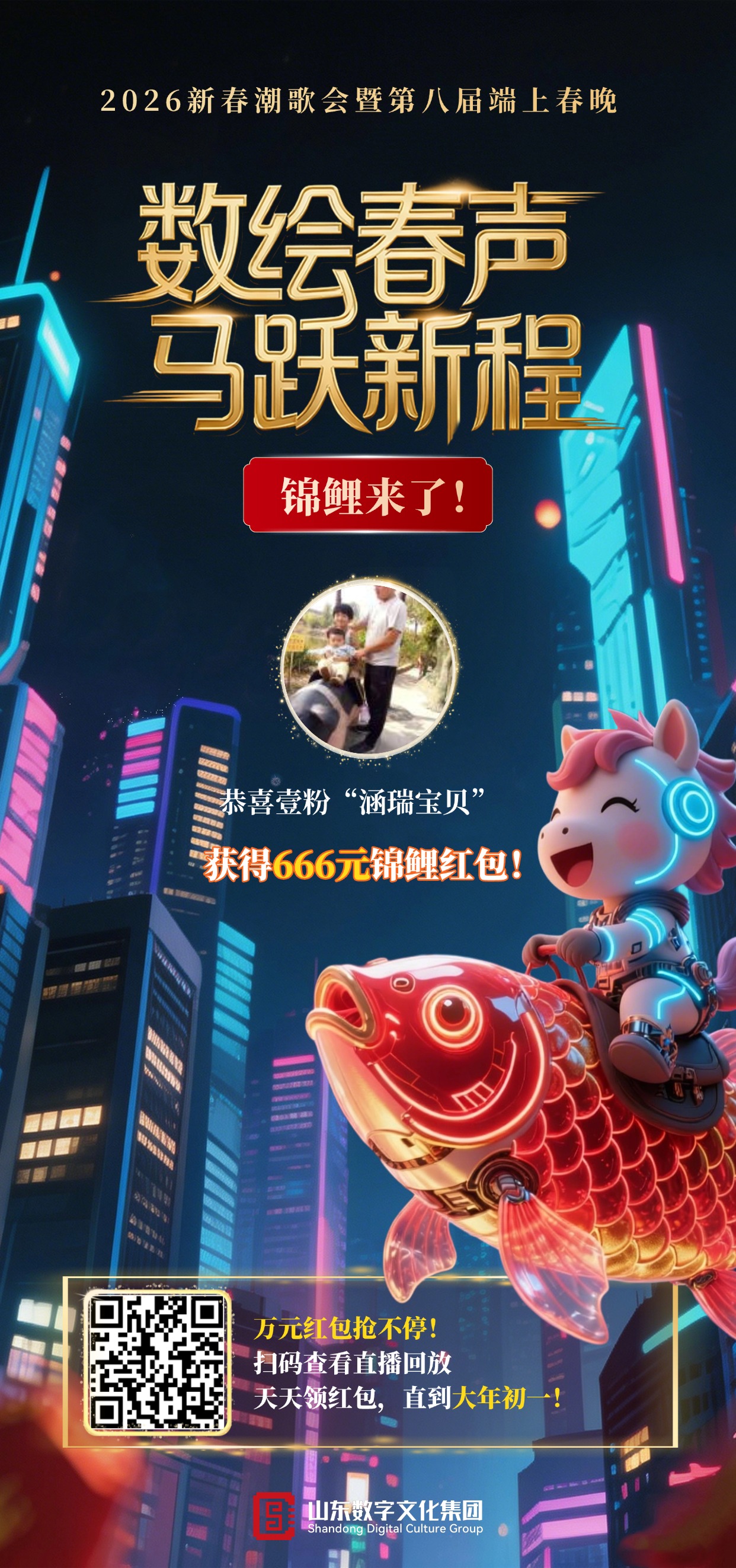 2月13日晚,济宁壹粉“涵瑞宝贝”在观看并参与“端上春晚”的直播互动中,摇到666元大红包,成为2026新春潮歌会暨第八届端上春晚锦鲤大奖获得者,恭喜!