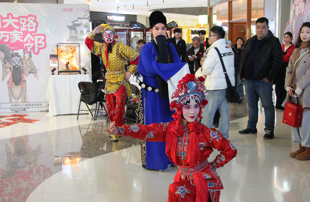 这是山东省柳子戏艺术保护传承中心(山东省柳子剧团)携手山大路街道,以“文蕴山大路 春惠万家邻”为主题启动的“非遗进商圈”专场活动。让演员们走下舞台,走出剧场,走向观众,将非遗传统戏曲艺术引入城市商业空间,通过“表演+体验”的沉浸式模式,打破舞台与生活的壁垒,拉近市民与非遗的距离。