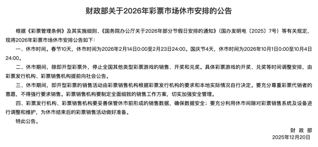 根据《财政部关于2026年彩票市场休市安排的公告》(中华人民共和国财政部公告2025年第14号),彩票市场春节期间休市10天,休市时间为2026年2月14日0:00至2月23日24:00。