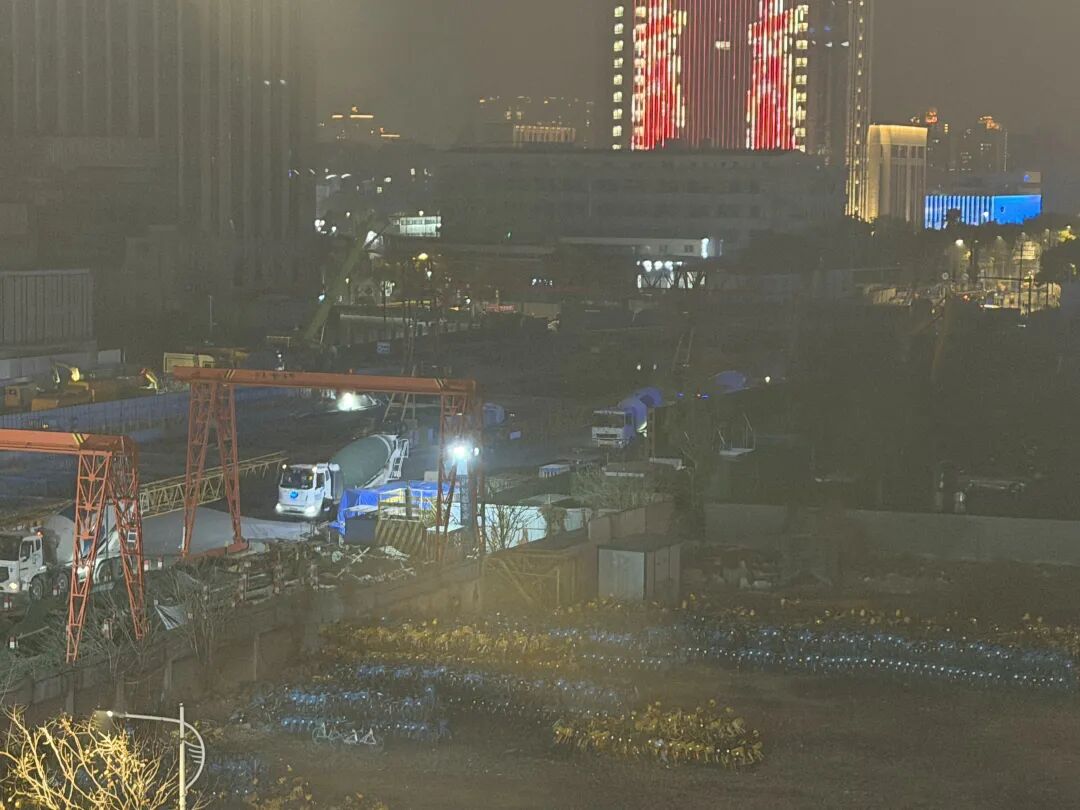 2月12日晚,塌陷核心区域有混凝土搅拌车正在灌注作业。