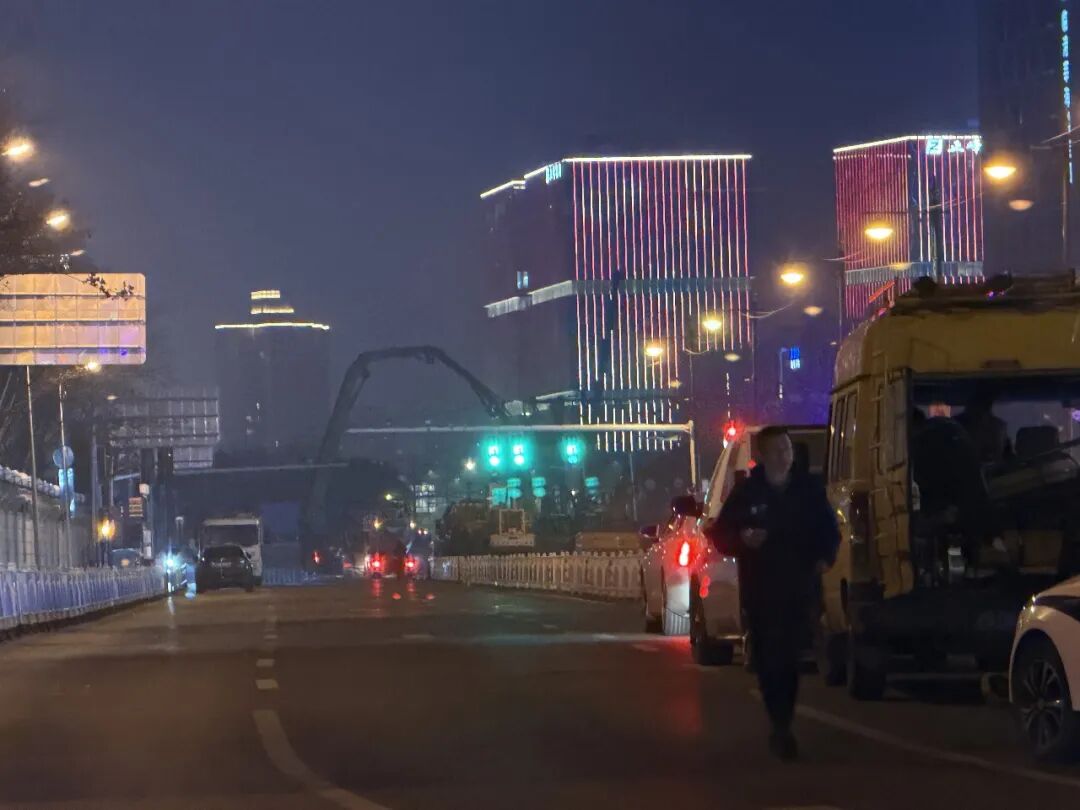 2月12日20时许,记者夜探抢修现场看到,现场有地铁、电信、联通、隧道、上海建工等多部门抢修人员正在施工,有大量混凝土搅拌车出入,抢修区域外围已设立警戒区,过往车辆需要绕行。
