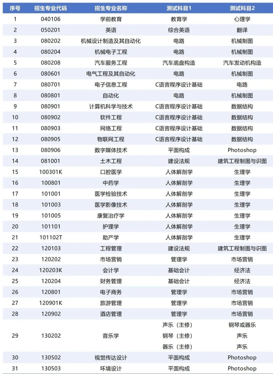 测试科目:考生需参加所报考专业2个科目的测试,总时长120分钟,两科连考,中间不间断。具体测试科目如下测试流程考生于2026年2月26日登录学校官网查看《山东协和学院2026年专升本自荐生专业测试线上测试操作说明》,按照操作说明要求进行线上模拟测试及正式测试。成绩公布2026年3月5日在学校官网公布测试结果。