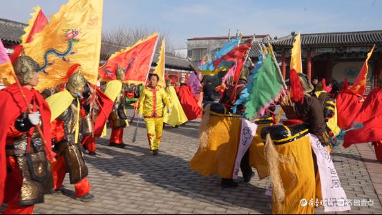 “齐了!”一声吆喝后,锣鼓镲响了,尖锐又厚实。20多位村民或拿旗帜、或执马首。起初脚步有些乱,旗走快了,马没跟上。有人站在队伍旁来回巡看提醒,几个回合下来,队伍顺了。