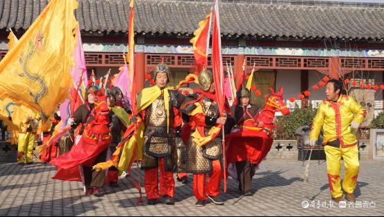 ▲牛洪峰(前左)在博平镇新春演出现场跑竹马打头旗