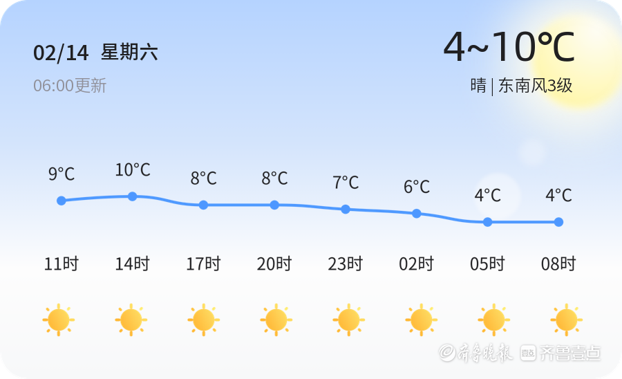 今天是2026年2月14日,农历十二月廿七,星期六,也是情人节。青岛市今天天气晴朗,气温在4℃至10℃之间,东南风3级,空气湿度为82%,PM2.5浓度为89,空气质量状况为良好。这样的天气非常适合户外活动,市民可以放心出行。今天是情人节,象征着爱与浪漫的节日。情侣们可以选择在公园、海边等风景优美的地方共度浪漫时光,同时也要注意防火安全,避免在户外使用明火。未来三天,青岛市天气以晴到多云为主,气温波动较大。明天阴转多云,气温在-1℃至7℃之间;后天多云,气温在-1℃至6℃之间;大后天多云,气温在2℃至7℃之间。市民需注意保暖,尤其是明天有弱冷空气影响,风力较大,外出时需做好防风准备。温馨提示