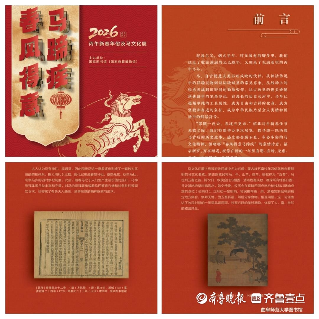 本次活动以丙午马年为重要契机,紧扣中华优秀传统文化传承核心,深度整合国家图书馆优质文化资源与曲阜师范大学馆藏古籍特色,创新性地打造了“线上+线下”全方位、多维度活动模式,涵盖了马文化民俗展览、春节诗歌共读、古籍春联共赏、新春阅读书目推荐、春节专题系列讲座等丰富内容,活动兼顾观赏性、体验感与知识性,让师生在多元参与中感受传统节日魅力,传承中华优秀文脉。