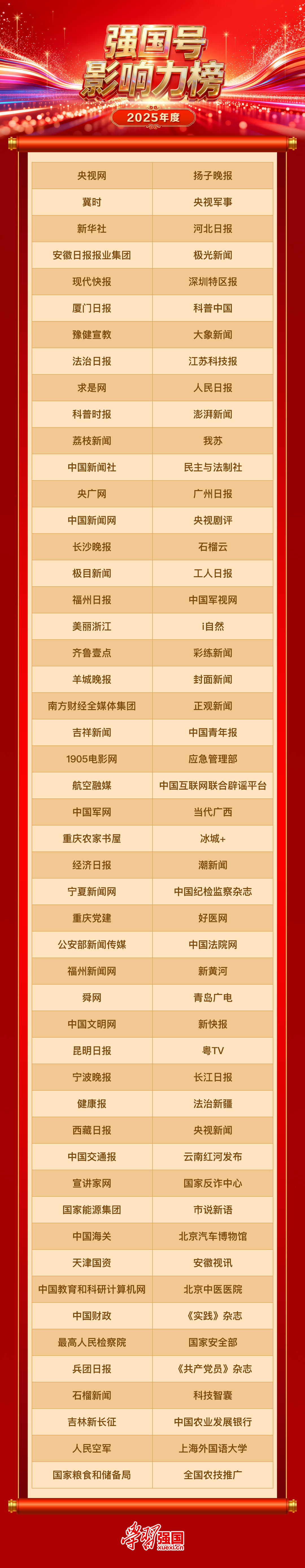 作为中宣部主管的国家级学习平台,"学习强国"自2019年1月1日正式上线以来,已吸引1100余家机构入驻。此次发布的2025年度影响力榜单,经过严格评选,从众多优质账号中精选出100家最具代表性的强国号。齐鲁壹点入驻以来,持续深耕内容创作,围绕时政资讯、民生服务、文化传播等领域输出精品,为“学习强国”学习平台广大用户提供了高质量内容。