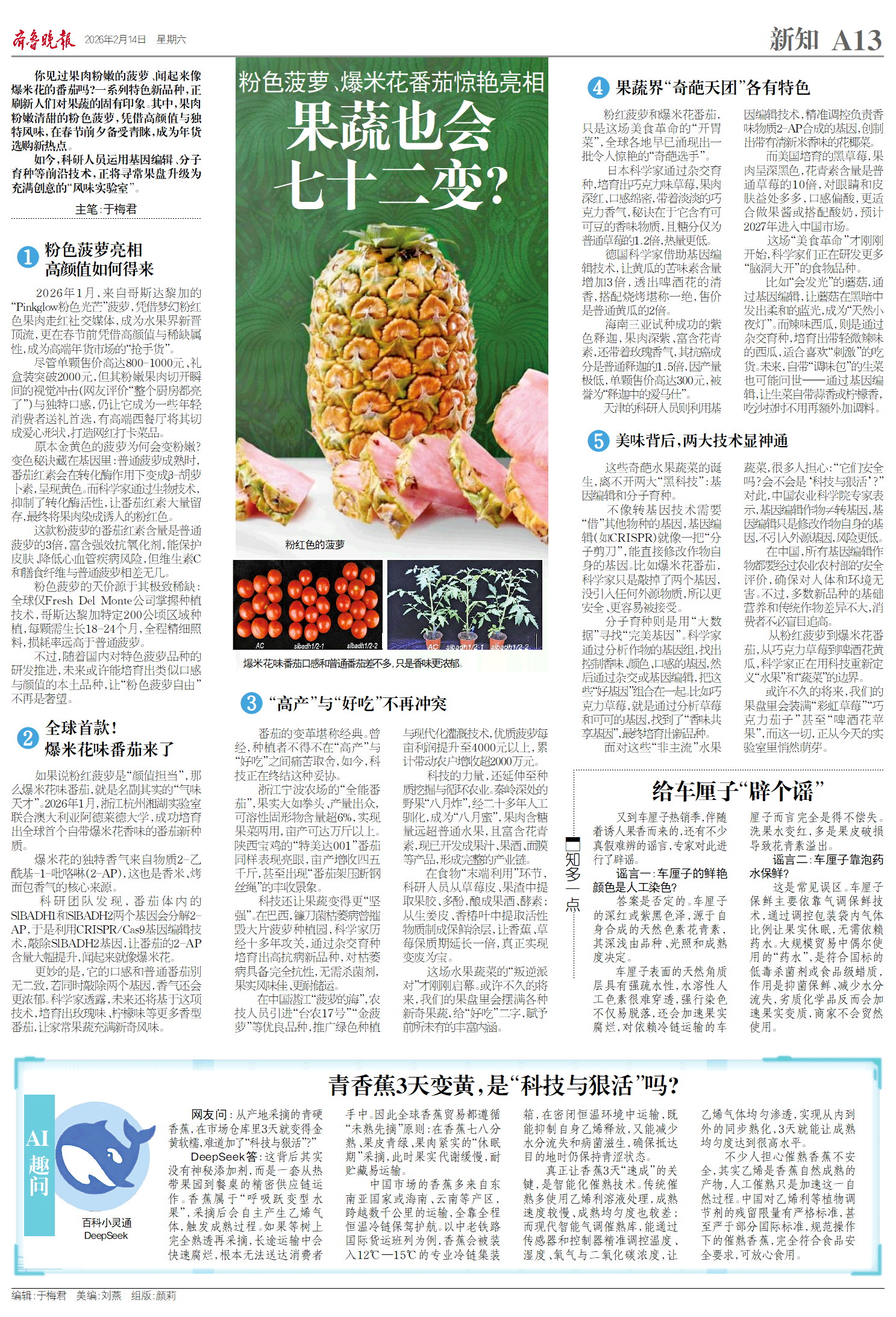 你见过果肉粉嫩的菠萝、闻着像爆米花的番茄吗?如果这些还不够新奇,巧克力味的草莓、带着啤酒花清香的黄瓜、飘着米香的花椰菜……这些新品种正在颠覆你对果蔬的认知。如今,科学家正运用基因编辑、分子育种等前沿科技,将寻常果盘变成充满惊喜的“风味实验室”。
