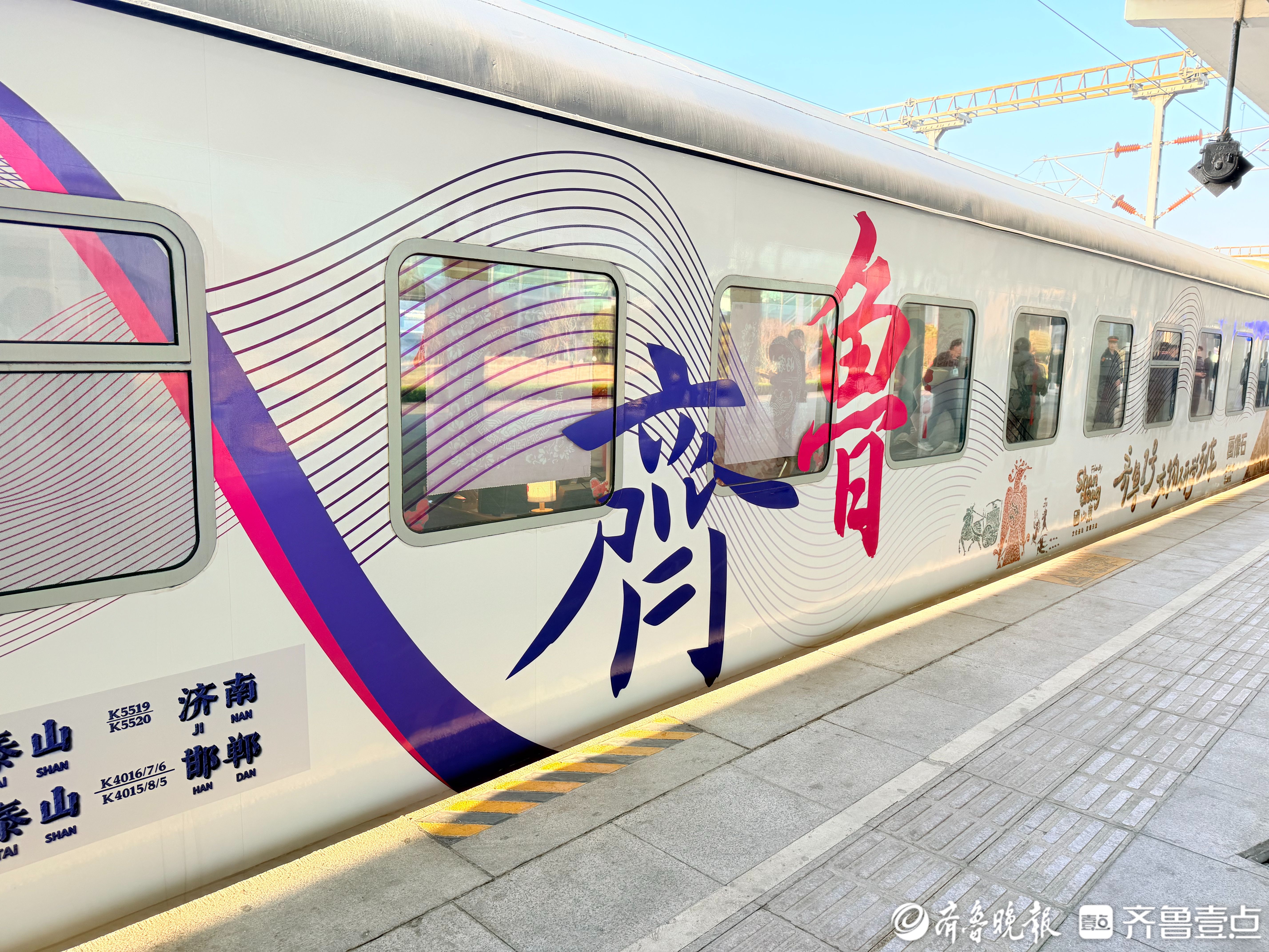 2月14日上午8点33分,“好客山东·齐鲁1号”文物研学主题旅游列车首班——K4016列车缓缓启动,开出泰山站,驶向河北邯郸。这是开行将近一年的“好客山东·齐鲁1号”旅游列车由大众游向文化深度游升级、由省内游向跨省游延伸的一次新的探索实践,将铁路客运与文物展示、研学体验深度融合,打造成为一列穿行于山东与河北之间的“铁轨上的移动博物馆”,为广大游客提供了一种全新的旅游体验方式,也是全国交文旅深度融合和区域旅游合作模式的全新探索实践。