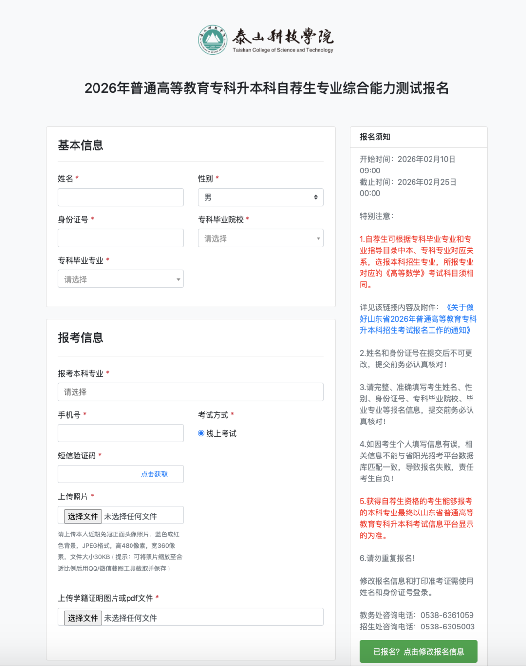 泰山科技学院2026年自荐生考试报名开始 考试安排公布