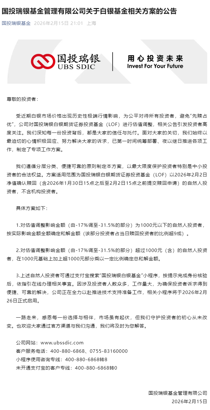 国投瑞银基金在2月15日的公告中表示,受近期白银市场价格出现历史性极端行情影响,为公平对待所有投资者,避免“先赎占优”,公司对国投白银LOF进行估值调整,相关公告引发投资者高度关注。公司深知每一份投资背后,都是大家的信任与托付。面对大家的关切,公司始终以最迫切的心情积极回应、努力解决大家的诉求,已第一时间统筹部署、夜以继日推进各项工作,制定了专项工作方案。该补偿方案遵循分层分类、便捷可靠的原则制定本方案,以最大限度保护投资者特别是中小投资者的合法权益。