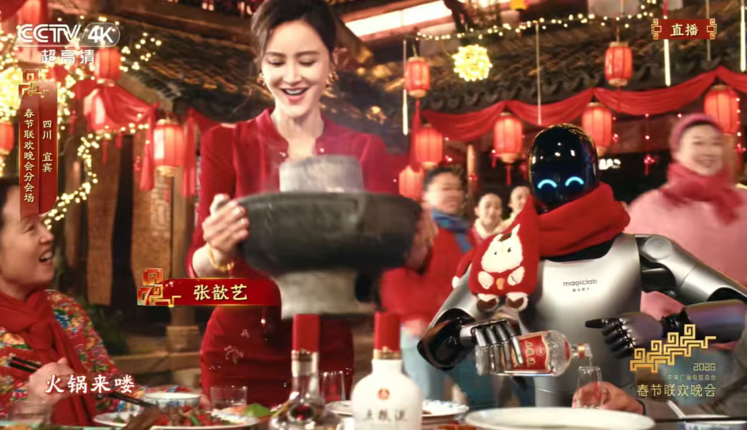 除了“机器大熊猫”之外,机器人还化身“捞面师”,完成起面、控水、倒面等连续操作,并为老人斟酒;“送餐员”身份的机器人也在节目组登场,将宜宾燃面稳稳送达,将一系列充满烟火气的动作拆解为可执行的能力展示。