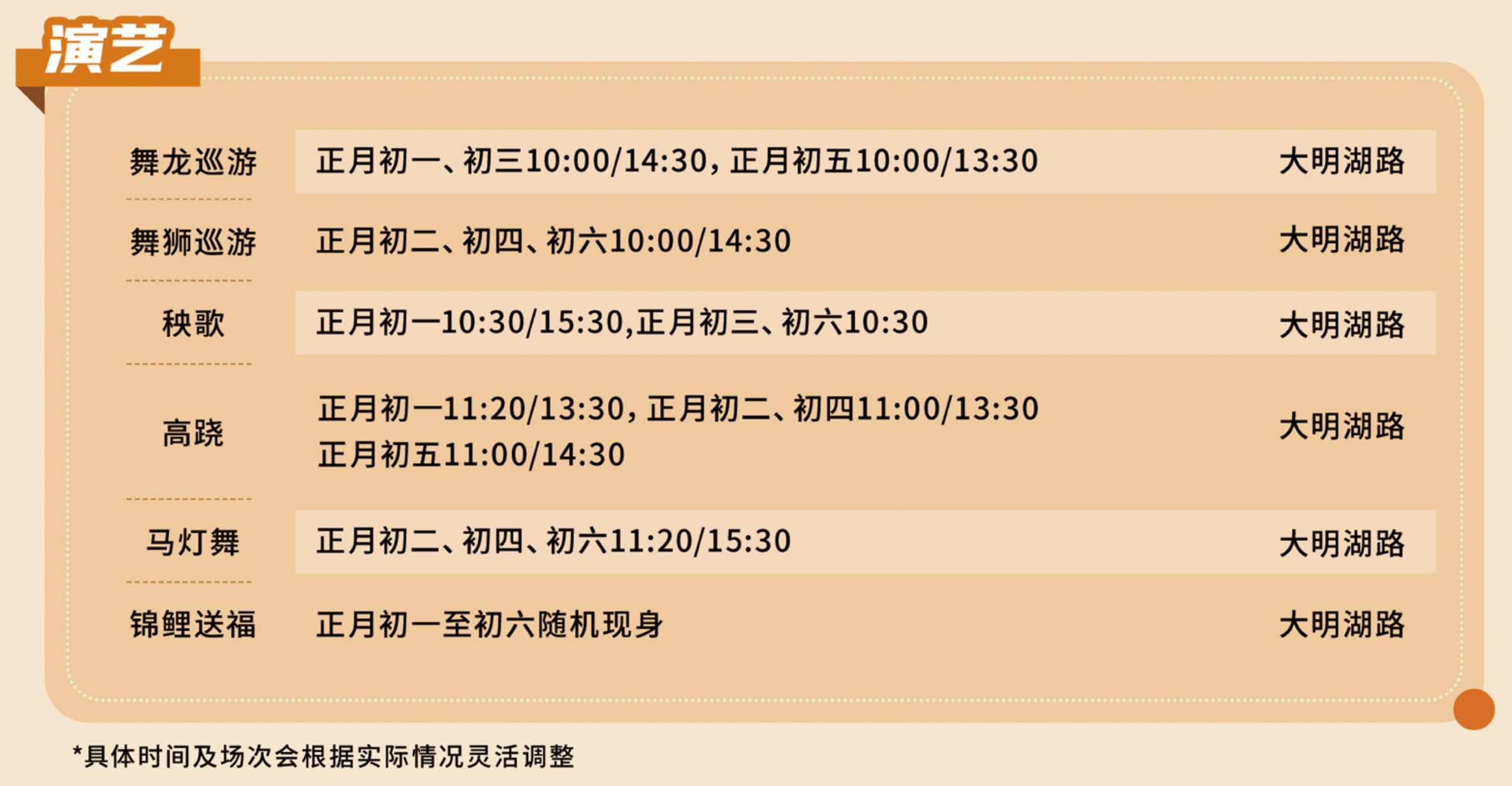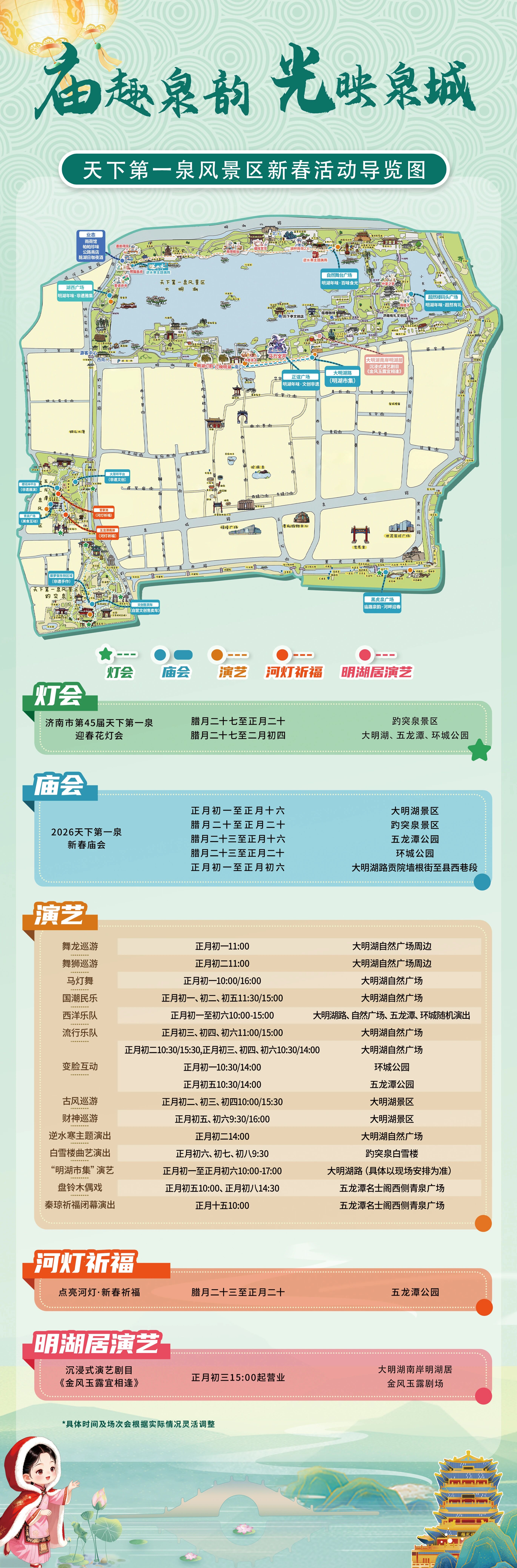 “庙趣明湖·光映泉城”新春游园会、“庙趣泉韵·马力全开”新春庙会、明湖市集、秦琼祈福文化旅游活动、明湖居演艺……这个春节假期,济南天下第一泉景区精彩活动陆续登场,把地道的泉畔年俗“大餐”打包给市民游客。 活动太多挑花眼?演艺去哪看?市集怎么逛?已贴心为你备好天下第一泉风景区新春活动导览图,伴你轻松畅游泉畔新春盛会。 2026·明湖市集演艺节目单