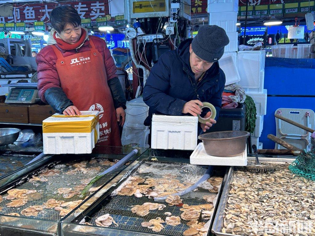 这些日子,孙玉霞和家人们每天天不亮就一头扎进市场,一直能忙到晚上八九点钟。“鱼类、虾类还有鲍鱼,这些海鲜都可以往外省发快递,走航空线,有冷链保证新鲜。”孙玉霞一边说,一边麻利地把冰块码在泡沫箱里。“顾客可以根据预算和需求,购买不同价位的年货礼盒。可以随意搭配,品尝不同种类的海鲜。”近年来,随着冷链物流不断升级提速,市场的商户们早已把生意做到了全国各地。从开海到忙年,长期与快递打交道,摊主个个练就了打包的本领。多少斤海鲜配多少冰,什么品种用多大的泡沫箱,心里都有一本账。
