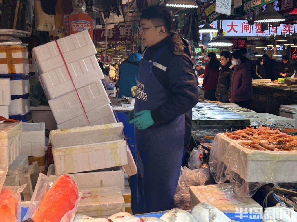 “麻烦多加点冰,送给外地亲戚的。”摊位前,一位中年男子购买了多箱海鲜。在市场,也有不少选购海鲜的市民,特意叮嘱摊主用泡沫箱加冰打包。“开车了吗,打包好一块给你拿过去。”摊主抄起大对虾,过秤、报价,转身拿过泡沫箱开始打包。“一些本地顾客开车来买礼盒,送人,吃着鲜亮。”趁着加冰的工夫,摊主随口介绍道。从本地人的“家庭厨房”,到“游”向全国餐桌。这是埠西海鲜市场的“春运”,也是年味的传递。